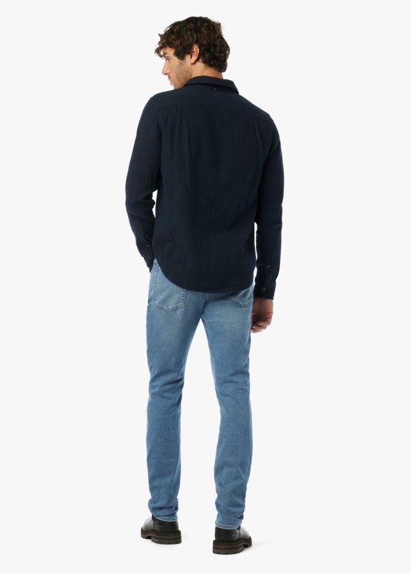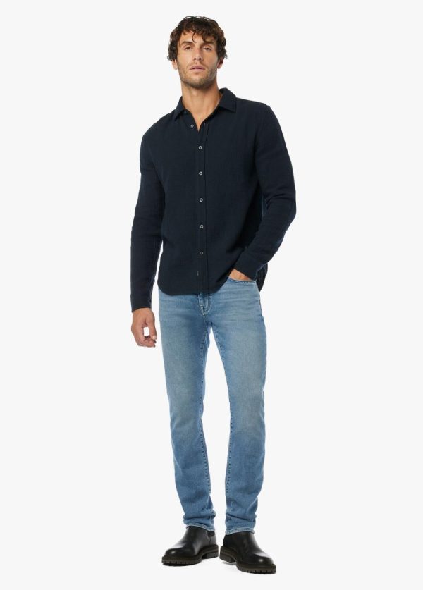 The Asher in Lirio is a slim fit jean in a light blue wash with local abrasion and subtle whiskering. Crafted from our comfortable French terry, The Asher has a buttery soft feel.